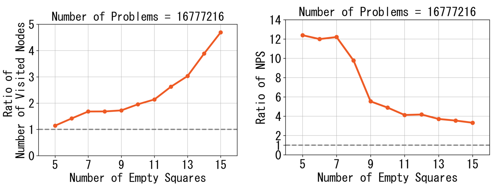 さらに、問題数を固定して空きマス数を変化させたときの訪問ノード数、NPSについて、それぞれCPUとの比をプロットしました。空きマス数が増えると、GPUでは訪問ノード数が飛躍的に増え、NPSが徐々に落ちていくことがわかります。訪問ノード数の増加はGPU版のmove orderingがCPU向けのものより簡素なためと思われます。NPSの減少は、ロードバランスアルゴリズムの限界によるものだと思われます。