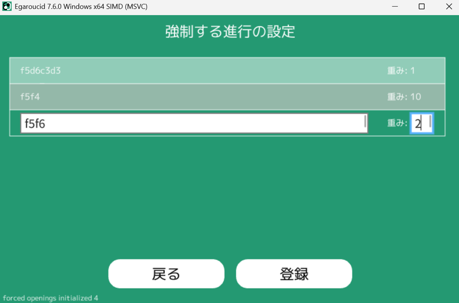 また、それぞれの進行には「重み」を設定できます。複数の進行を登録した場合、どの進行を選ぶかは確率的に決まりますが、重みが大きければ大きいほど、その進行が選ばれる確率が高くなります。具体的には、ある盤面が登録した進行に現れ、かつ登録されている手が複数あるとき、それらの手の重みの集合を$\{W\}$、$m$という手の重みを$w$とすると、